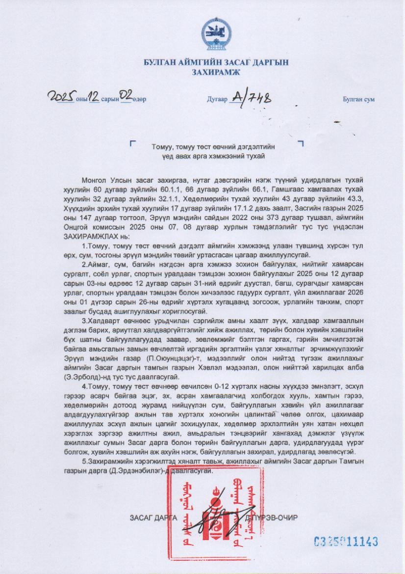 Томуу, томуу төст өвчин аймгийн хэмжээнд улаан түвшинд хүрсэн тул аймаг, сум, багийн нэгдсэн арга хэмжээ, нийтийг хамарсан сургалт, соёл урлаг, спортын уралдаан тэмцээн зохион байгуулахыг 2025 оны 12 дугаар сарын 31-ний өдрийг дуустал, багш, сурагчдыг хамарсан урлаг, спортын уралдаан тэмцээн болон хичээлээс гадуурх сургалт, үйл ажиллагааг 2026 оны 01 дүгээр сарын 26-ны өдрийг хүртэлх хугацаанд зогсоож, урлагийн танхим, спорт заалыг бусдад ашиглуулахыг хориглосон аймгийн Засаг даргын захирамж гарлаа.