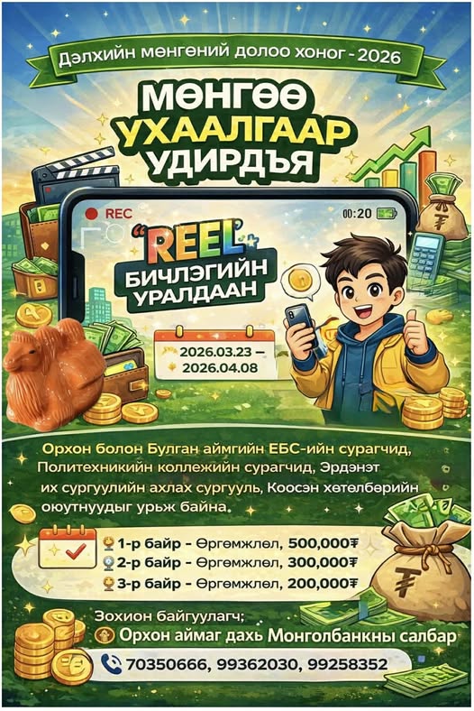 Орхон аймаг дахь Монголбанкны салбарын санаачилгаар “Дэлхийн мөнгөний долоо хоног-2026” аяны хүрээнд ЕБС, коллеж, ахлах сургуулийн сурагчид болон Коосэн хөтөлбөрийн оюутнуудын дунд “Мөнгөө ухаалгаар удирдъя” сэдэвт Reel бичлэгийн уралдаан зохиогдох гэж байна.